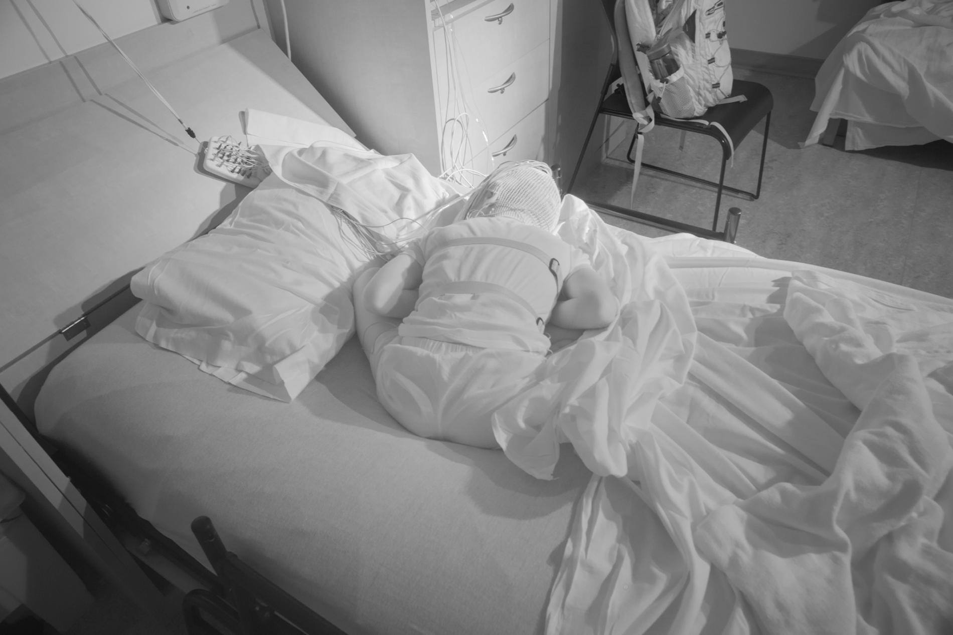 Michael Bosak sleeps through his exam in a position that helps prevent the repeated narrowing of the upper airway—the cause of his snoring. This photo was taken in the dark with an infrared camera so as not to disturb him.
